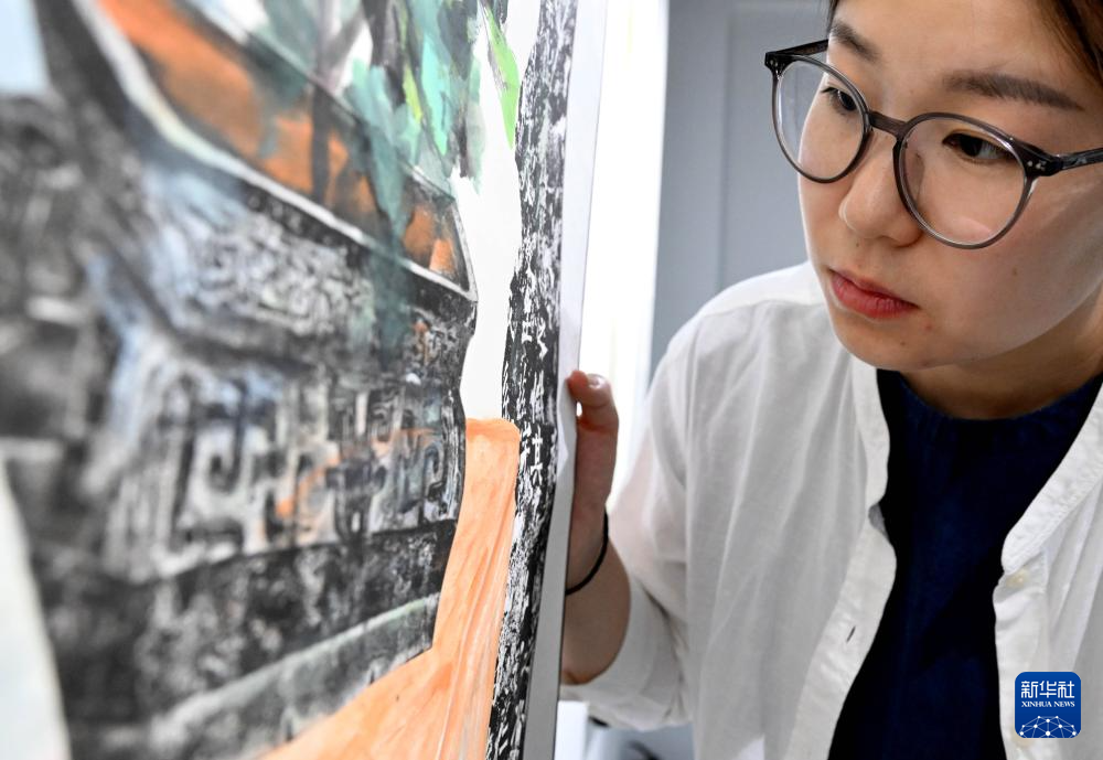 在洛阳华夏金石文化博物馆,钱夏玉在观看金石博古画成品(9月11日摄)。