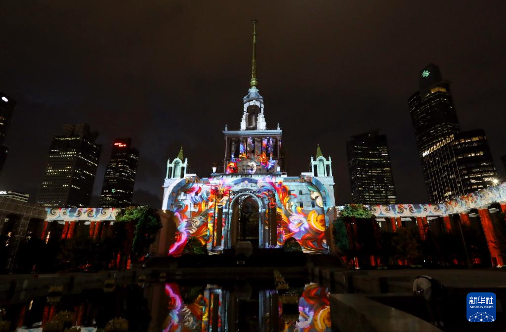 这是9月18日在上海展览中心拍摄的建筑投影秀彩排现场。