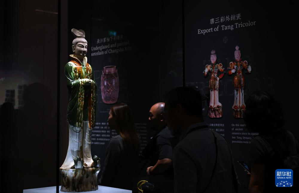 11月16日,观众在保利美高梅博物馆参观展出的唐三彩文官俑。