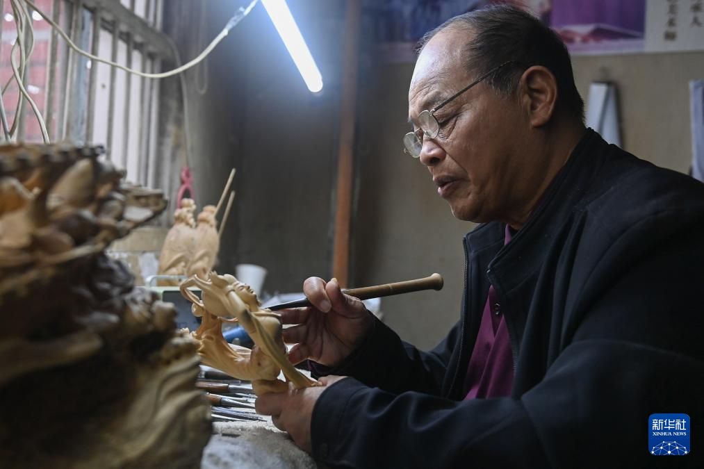 虞金顺在工作室雕刻一件乐清黄杨木雕作品(11月25日摄)。