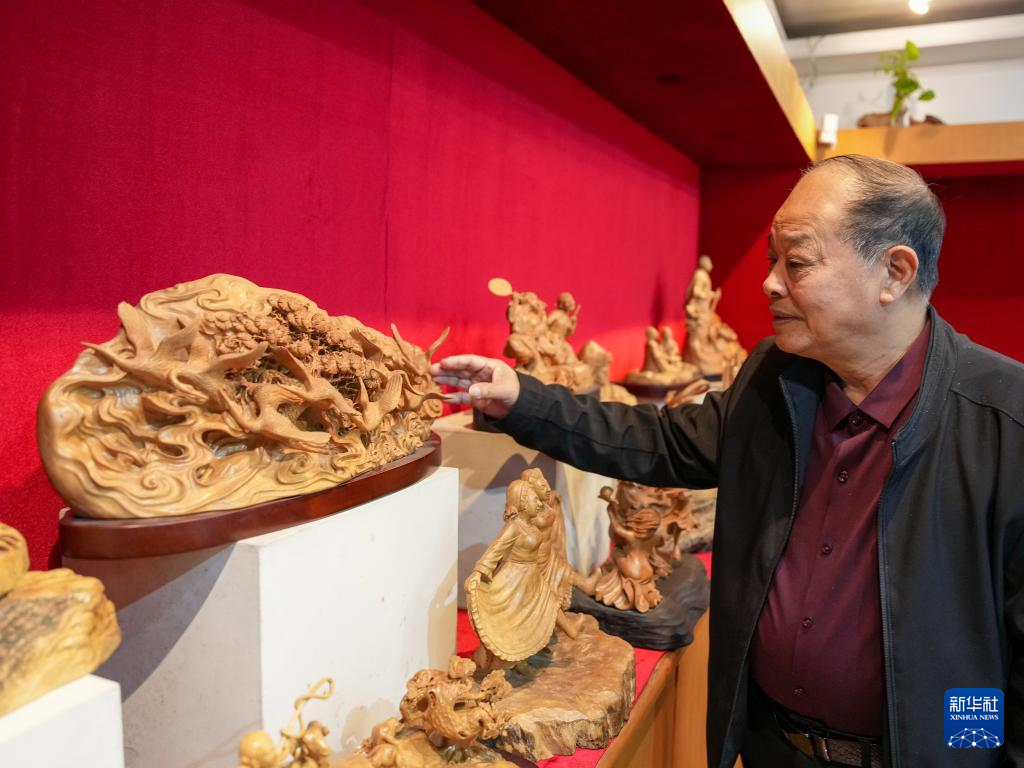 虞金顺在工作室展示自己创作的乐清黄杨木雕作品(11月25日摄)。