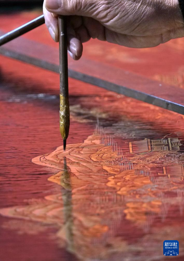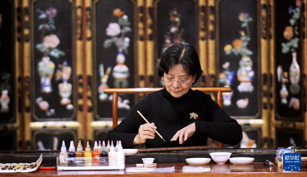 胡昕在工作室内创作金漆镶嵌作品(12月10日摄)。