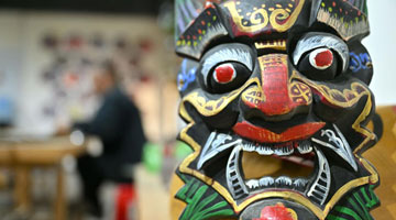 近日,湖北省恩施土家族苗族自治州傩面具制作传承人汪儒斌正忙着手工雕刻、绘制一批傩面具,为即将进行的一场傩文化研学活动作准备。