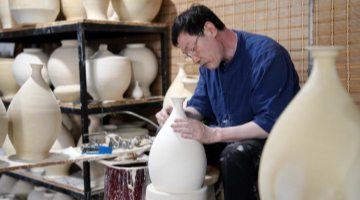6月28日,在河北省临城县邢窑文化博览园,张志忠进行邢白瓷拉坯作业。