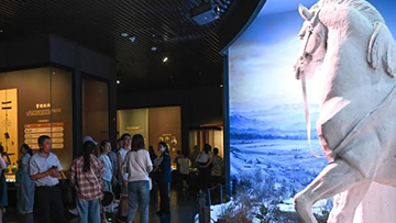 8月17日,佩戴导览智能眼镜的观众在一尊古埃及鹰神神像前驻足观看。