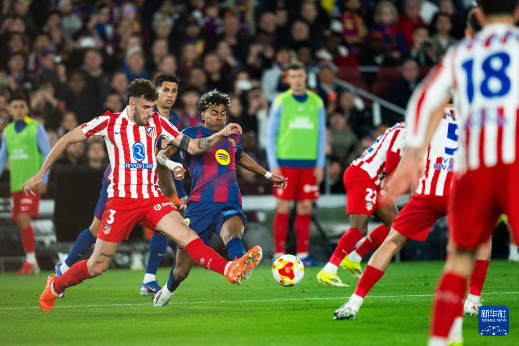 3月3日,巴塞罗那队球员亚马尔(右)与马德里竞技队球员卢克曼在比赛中拼抢。