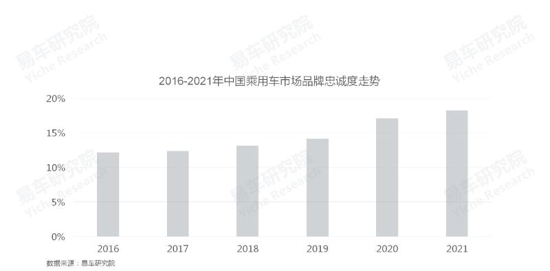 作为中国车市非商业智库,易车研究院近几年一直在优化方法论,做好基础数据的储备与提炼。2016~2021年,中国车市的品牌忠诚度一直处于上升状态,近两年的上升幅度更快,2021年升至18.24%,估计2022-2023年就能突破20%;