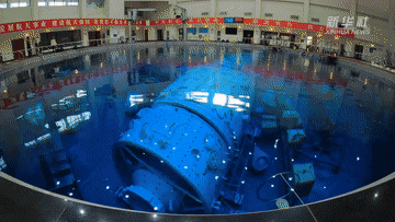 這里是航天員模擬失重水槽訓(xùn)練場(chǎng)。當(dāng)飛船繞地心運(yùn)動(dòng)時(shí),會(huì)產(chǎn)生失重。航天員要在失重狀態(tài)下進(jìn)行空間出艙活動(dòng)和裝配維修等任務(wù)。實(shí)踐證明,模擬失重水槽訓(xùn)練是在地面上進(jìn)行航天員艙外活動(dòng)訓(xùn)練的最為有效方法。