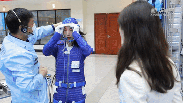 這里是離心機(jī)訓(xùn)練場(chǎng)。離心機(jī)由一個(gè)八米長(zhǎng)的旋轉(zhuǎn)臂和飛行模擬座艙組成,它所產(chǎn)生的離心力通常用地心引力的倍數(shù)表示。例如2G等于兩倍地球引力,大概相當(dāng)于過(guò)山車(chē)從最高點(diǎn)急速俯沖到最低點(diǎn)時(shí)的壓迫感。普通人最多能承受4G的離心力,而像亞平一樣的航天員則要進(jìn)行8G的過(guò)載訓(xùn)練。