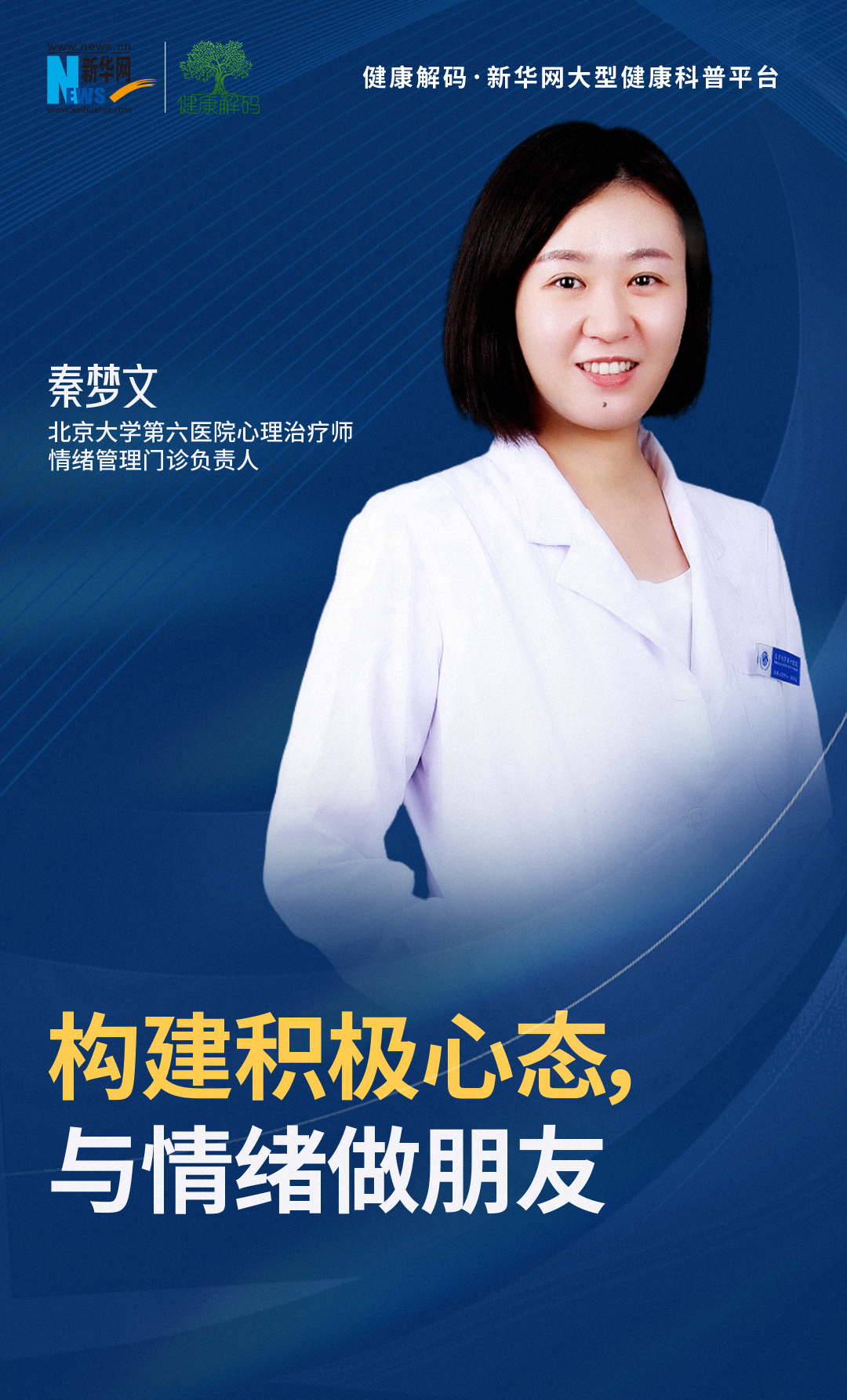 本集《健康解码·心理健康系列》邀请了北京大学第六医院心理治疗师、情绪管理门诊负责人秦梦文分享《构建积极心态 与情绪做朋友》。