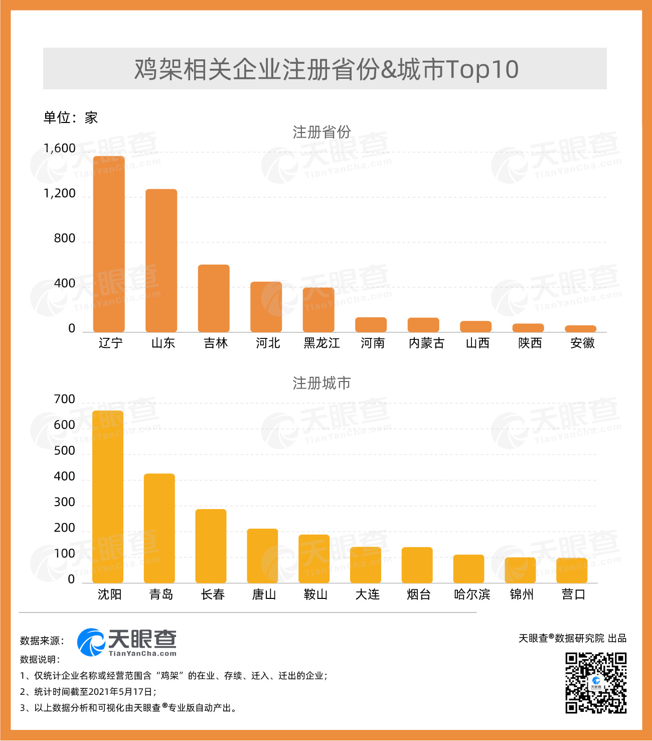 ????? 從地域分布上看,遼寧的雞架相關企業(yè)數(shù)量最多,有近1,600家,占全國近3成。其次為山東,有1,200余家雞架相關企業(yè)。分城市來看,沈陽以670余家雞架相關企業(yè)位居全國首位,其次為青島,有400余家相關企業(yè)。天眼查數(shù)據(jù)顯示,近年來我國雞架相關企業(yè)年注冊量整體呈現(xiàn)上漲趨勢。2019年,我國新增2,200余家雞架相關企業(yè),年注冊量達到歷史最高。2020年,我國新增近2,000家雞架相關企業(yè)。