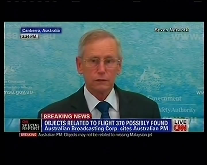 ??? 澳方稱在印度洋中發(fā)現(xiàn)了可能與馬航失聯(lián)客機(jī)有關(guān)物體這張3月20日拍攝的CNN視頻截圖顯示,澳大利亞海事安全局官員在堪培拉召開的新聞發(fā)布會上發(fā)言(左圖為相關(guān)搜尋海域的示意圖)。澳大利亞總理阿博特當(dāng)日在議會說,澳方在印度洋中發(fā)現(xiàn)了可能與馬航失聯(lián)客機(jī)有關(guān)的兩個物體。澳大利亞海事安全局官員當(dāng)日說,發(fā)現(xiàn)可疑碎片的位置與之前確定的馬航失聯(lián)客機(jī)南部搜尋航道高度吻合,但當(dāng)?shù)睾S蛩沫h(huán)境非常差。新華社發(fā)