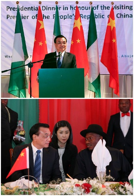 ??? 新華網(wǎng)北京5月8日電? 據(jù)新華社“新國際”微博報(bào)道,當(dāng)?shù)貢r(shí)間7日晚,尼日利亞總統(tǒng)喬納森夫婦在總統(tǒng)府為李克強(qiáng)總理和夫人程虹舉行隆重歡迎宴會(huì)?,F(xiàn)場(chǎng)尼方兩次奏響中國國歌,感謝李克強(qiáng)在尼安全局勢(shì)嚴(yán)峻時(shí)刻“冒險(xiǎn)”訪問,感謝中方對(duì)尼的巨大支持。