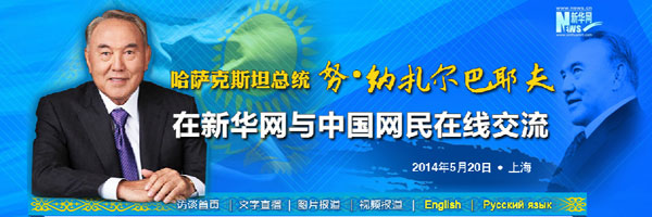 ??? 新華網(wǎng)上海5月20日電 哈薩克斯坦總統(tǒng)納扎爾巴耶夫20日接受新華網(wǎng)獨(dú)家訪談與中國網(wǎng)民在線交流,回答中國網(wǎng)民的問題。