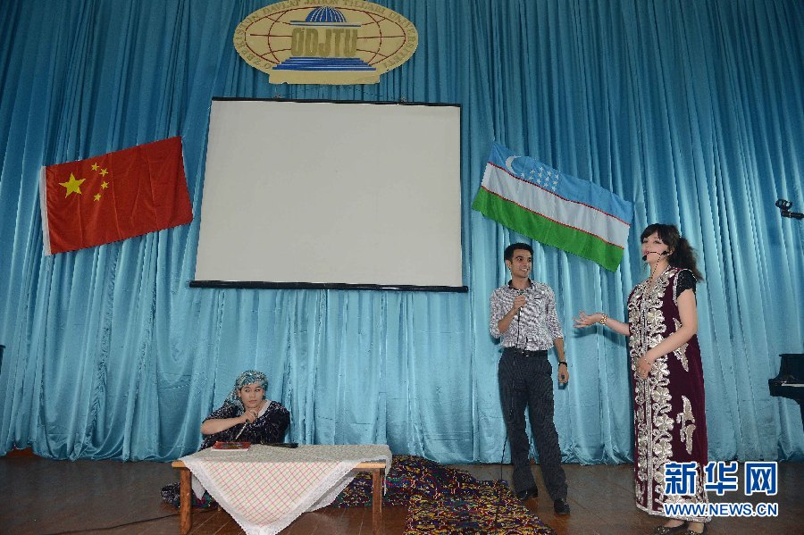 6月9日,學(xué)生代表在烏茲別克斯坦首都塔什干的烏世界語(yǔ)言大學(xué)禮堂表演節(jié)目。
