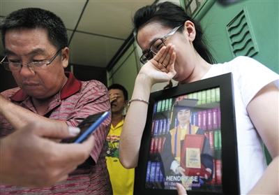 18日,一名印尼乘客的家屬在接受媒體采訪時(shí)痛哭。