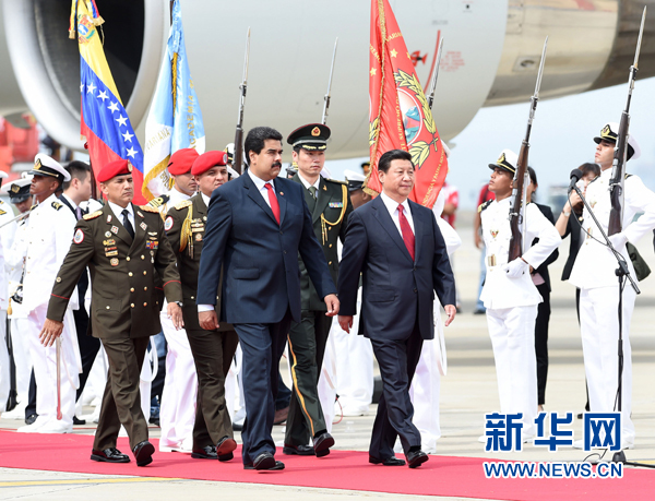????馬杜羅在機(jī)場(chǎng)為習(xí)近平舉行隆重歡迎儀式。兩國(guó)元首登上檢閱臺(tái)。軍樂(lè)團(tuán)奏委中兩國(guó)國(guó)歌,升中國(guó)國(guó)旗。習(xí)近平在馬杜羅陪同下檢閱儀仗隊(duì)。
