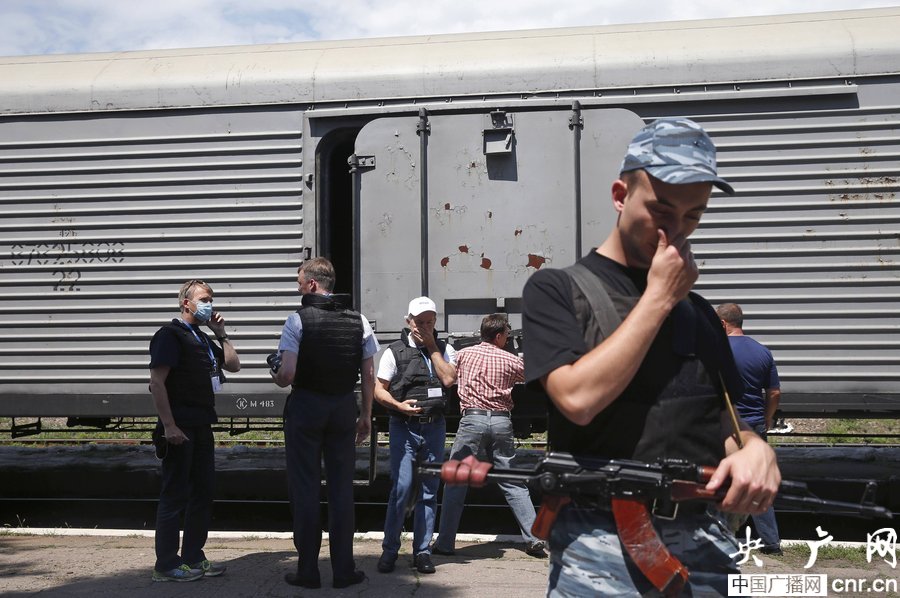 當(dāng)?shù)貢r間2014年7月20日,烏克蘭頓涅茨克Torez,馬航墜機遇難乘客遺體被裝上列車冷藏車廂將被運走。載有部分遺體的火車從距空難現(xiàn)場不遠的烏克蘭托列茲市出發(fā),前往頓涅茨克市?;疖囯x站前,身處空難現(xiàn)場的歐洲安全與合作組織(歐安組織)代表檢查了運載遺體的5節(jié)冷藏車廂。