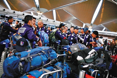 當(dāng)?shù)貢r(shí)間7月18日,馬來(lái)西亞國(guó)際機(jī)場(chǎng),馬來(lái)西亞派特殊救災(zāi)和救援小組成員前往MH17墜機(jī)事故現(xiàn)場(chǎng)。圖/CFP