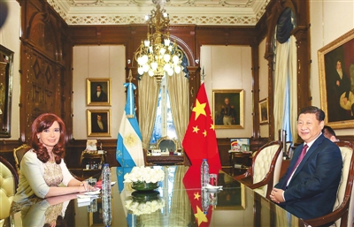 7月18日,國家主席習(xí)近平在布宜諾斯艾利斯同阿根廷總統(tǒng)克里斯蒂娜舉行會談,兩國元首就中阿關(guān)系及共同關(guān)心的問題深入交換意見,達成重要共識,一致決定將中阿關(guān)系提升為全面戰(zhàn)略伙伴關(guān)系,堅定把對方視為重要發(fā)展機遇和發(fā)展伙伴,加強互利合作和戰(zhàn)略協(xié)作,造福兩國和兩國人民,增強新興市場國家和發(fā)展中國家團結(jié)合作。