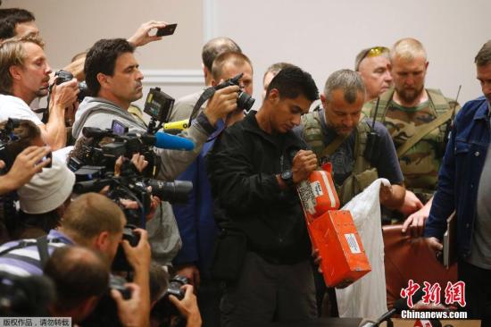當?shù)貢r間2014年7月22日,頓涅茨克,“頓涅茨克人民共和國”官員向馬來西亞調(diào)查人員移交馬航MH17航班客機黑匣子。
