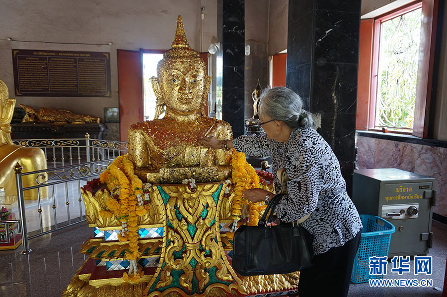 一名許愿者正向金佛模型上貼金箔。新華網(wǎng)記者 楊云燕 攝