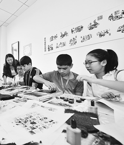 2014年8月14日,上合組織成員國首批中學(xué)生交流夏令營來到天津。圖為來自塔吉克斯坦的中學(xué)生與中國學(xué)生一起體驗(yàn)活字印刷術(shù)。