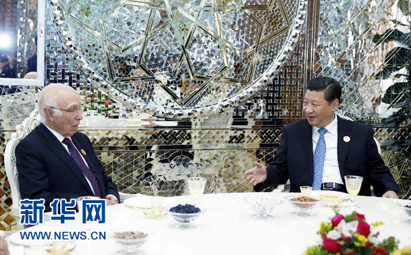 ????9月12日,國家主席習(xí)近平在杜尚別會見巴基斯坦總理國家安全和外事顧問阿齊茲。新華社記者鞠鵬攝