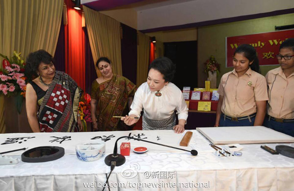 ????新華網(wǎng)北京9月18日電 據(jù)新華社“新國(guó)際”微博報(bào)道,習(xí)近平主席夫人彭麗媛18日上午在新德里參觀泰戈?duì)枃?guó)際學(xué)校時(shí),用毛筆書(shū)寫(xiě)成語(yǔ)“溫故知新”,并簽名蓋上印章。她對(duì)師生們逐字講解后說(shuō),我們要經(jīng)常溫習(xí)學(xué)過(guò)的知識(shí),不斷學(xué)習(xí)掌握新知識(shí),開(kāi)拓創(chuàng)新,與時(shí)俱進(jìn)。希望同學(xué)們認(rèn)真學(xué)習(xí),更好報(bào)效祖國(guó),祝你們成功。