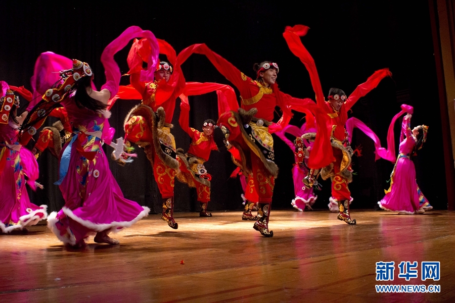 來(lái)自中南民族大學(xué)的演員在臺(tái)上表演。新華網(wǎng)發(fā) Xesco攝