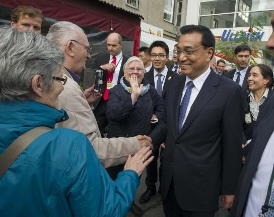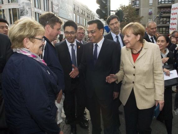 見到兩國總理到來,路邊不少民眾圍了上來,爭相與他們握手、合影。默克爾還把克強總理介紹給一位7、8歲的德國小女孩:“這是我的中國同事。”