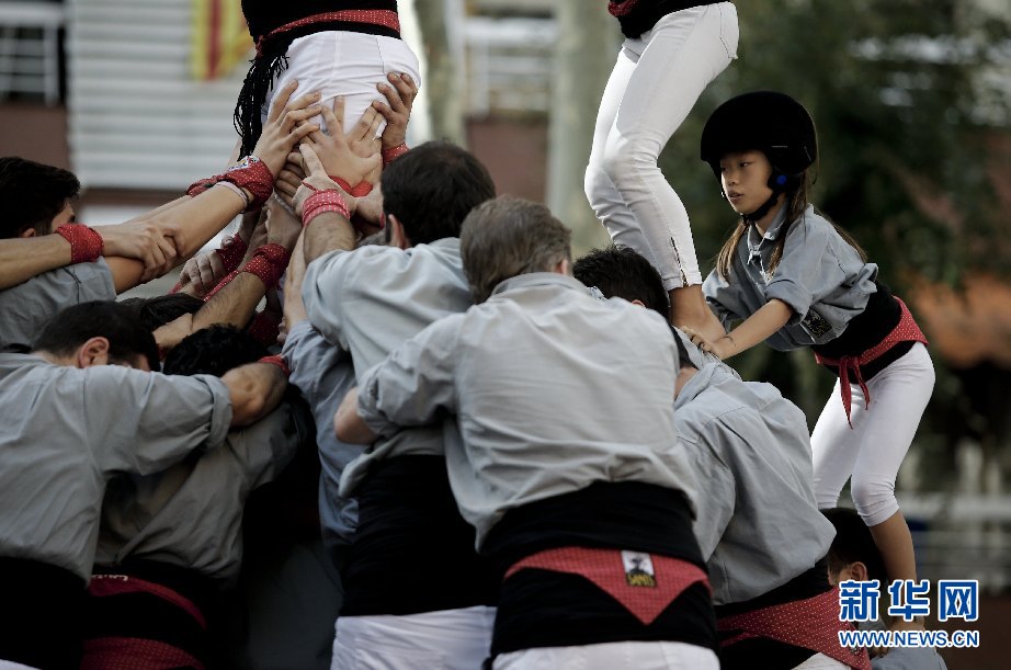 表演中,Jana開始爬“人塔”。新華社巴塞羅那分社攝影師Pau Barrena 攝