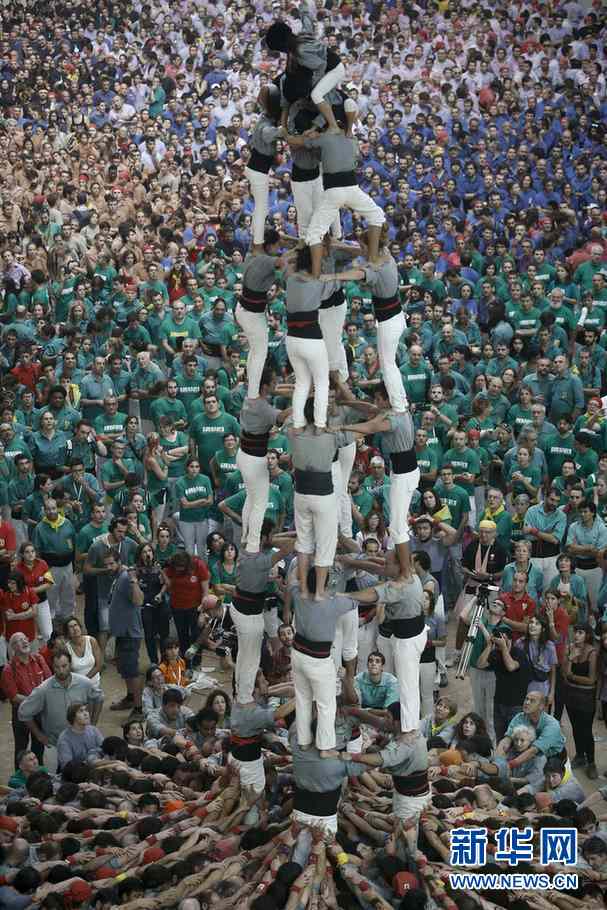 ????在西班牙加泰羅尼亞地區(qū)的塔拉戈納市(Tarragona)舉行的一次“疊人塔”大賽上,Jana爬到Sants區(qū)代表隊(duì)的頂端。新華社巴塞羅那分社攝影師Pau Barrena 攝?