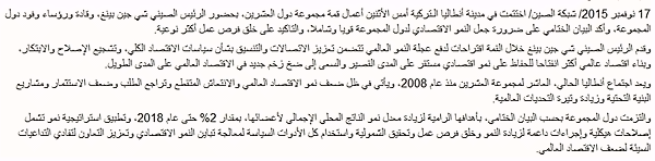 昨日,二十國集團(tuán)領(lǐng)導(dǎo)人第十次峰會(huì)在土耳其安塔利亞閉幕。中國領(lǐng)導(dǎo)人習(xí)近平期間出席了峰會(huì),并發(fā)表題為《創(chuàng)新增長路徑 共享發(fā)展成果》的重要講話,其中強(qiáng)調(diào)二十國集團(tuán)要加強(qiáng)宏觀經(jīng)濟(jì)政策溝通和協(xié)調(diào),推動(dòng)改革創(chuàng)新,構(gòu)建開放型世界經(jīng)濟(jì)。