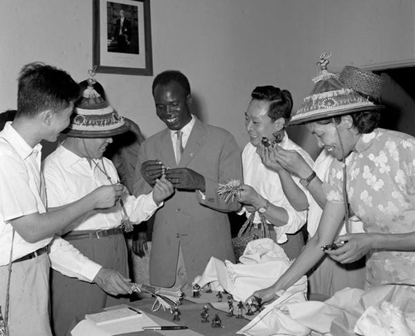 中非人民友好協(xié)會代表團在1961年2月24日到6月19日的四個月中,訪問了幾內(nèi)亞、馬里、加納、尼日爾等八個西非國家。圖為非洲朋友向代表團贈送禮品。(新華社記者孟憲全攝)
