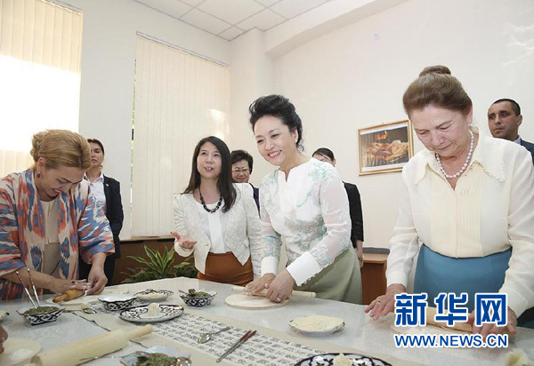 當(dāng)?shù)貢r(shí)間6月22日下午,國(guó)家主席習(xí)近平夫人彭麗媛同烏茲別克斯坦總統(tǒng)卡里莫夫夫人卡里莫娃共同參觀塔什干孔子學(xué)院。這是彭麗媛向?qū)W生們示范包餃子。新華社記者丁林?jǐn)z