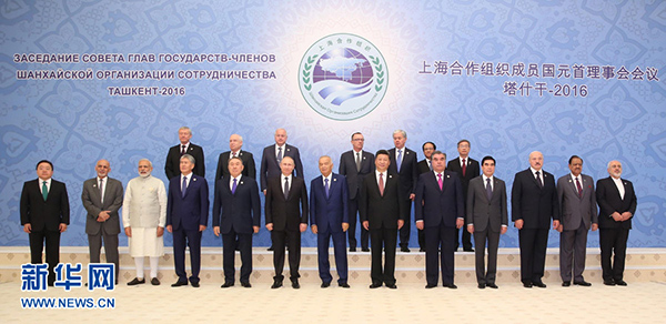 6月24日,國(guó)家主席習(xí)近平在烏茲別克斯坦塔什干出席上海合作組織成員國(guó)元首理事會(huì)第十六次會(huì)議并發(fā)表重要講話。這是大范圍會(huì)談開始前,習(xí)近平同哈薩克斯坦總統(tǒng)納扎爾巴耶夫、吉爾吉斯斯坦總統(tǒng)阿坦巴耶夫、俄羅斯總統(tǒng)普京、塔吉克斯坦總統(tǒng)拉赫蒙、烏茲別克斯坦總統(tǒng)卡里莫夫,觀察員國(guó)阿富汗總統(tǒng)加尼、白俄羅斯總統(tǒng)盧卡申科、印度總理莫迪、蒙古國(guó)總統(tǒng)額勒貝格道爾吉、巴基斯坦總統(tǒng)侯賽因、伊朗外交部長(zhǎng)扎里夫,主席國(guó)客人土庫(kù)曼斯坦總統(tǒng)別爾德穆哈梅多夫以及有關(guān)國(guó)際和地區(qū)組織代表集體合影。新華社記者 丁林 攝
