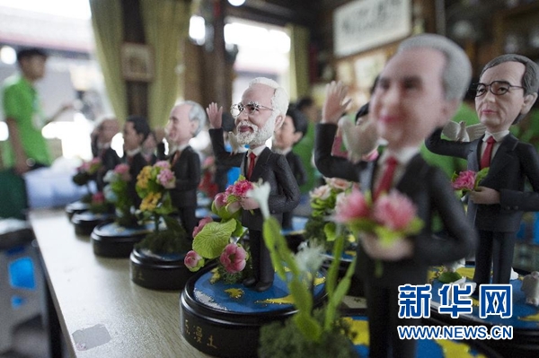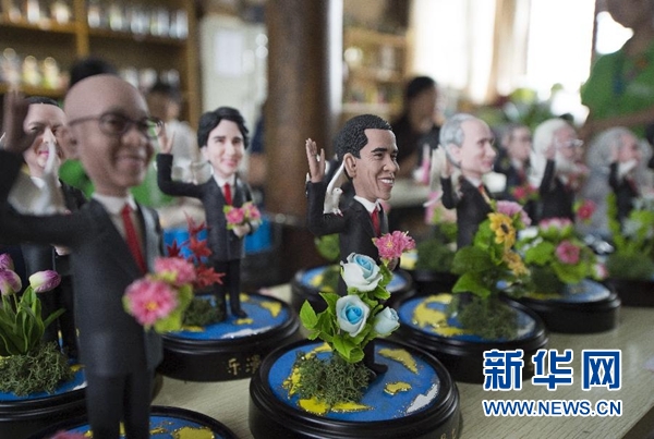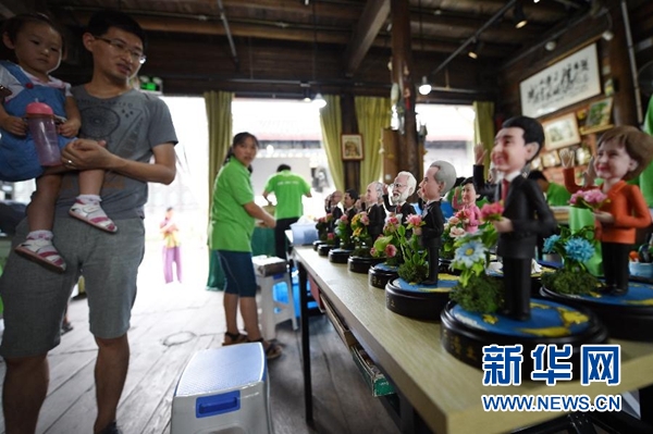 9月1日,手工藝人吳小莉創(chuàng)作的捏塑作品G20杭州峰會參會領(lǐng)導人形象在杭州京杭大運河畔的橋西歷史街區(qū)擺放展示。新華社記者 鞠煥宗 攝