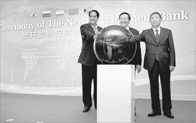 2015年7月21日,新開發(fā)銀行開業(yè)儀式在上海舉行。財政部部長樓繼偉(中)與上海市市長楊雄(右)、金磚國家新開發(fā)銀行行長卡馬特共同啟動新開發(fā)銀行。 資料圖片