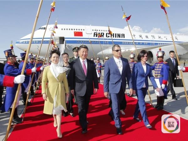 為了迎接習(xí)主席夫婦,科雷亞總統(tǒng)打破厄國內(nèi)《公共典禮條例》和總統(tǒng)不赴機(jī)場迎送外國元首的慣例,親赴機(jī)場主持隆重的歡迎儀式;兩名身著民族服裝的當(dāng)?shù)貎和蛄?xí)主席夫婦獻(xiàn)上鮮花;兩國元首登上檢閱臺(tái),軍樂隊(duì)奏響中厄兩國國歌。習(xí)主席和科雷亞總統(tǒng)分別發(fā)表了熱情洋溢的致辭。