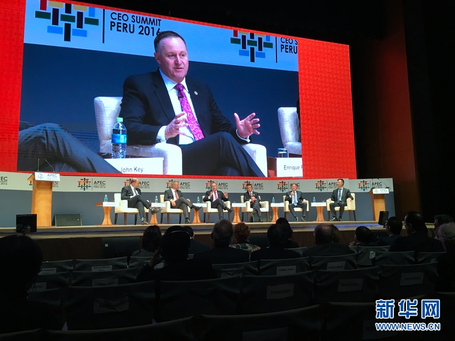 當?shù)貢r間11月19日,APEC工商領導人峰會舉行主題為“重新設計貿(mào)易”的現(xiàn)場討論會。圖為新西蘭總理約翰·基在討論會上發(fā)言。