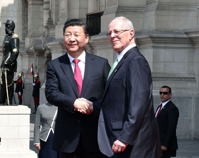 11月21日,國家主席習(xí)近平在利馬同秘魯總統(tǒng)庫琴斯基舉行會談。會談前,習(xí)近平出席庫琴斯基在總統(tǒng)府前廣場舉行的歡迎儀式。(新華社記者 李濤 攝)