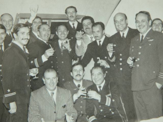 金仁伯(中排左3)在“阿基萊斯”號(hào)上與智利官兵及科考人員干杯。(金仁伯提供)