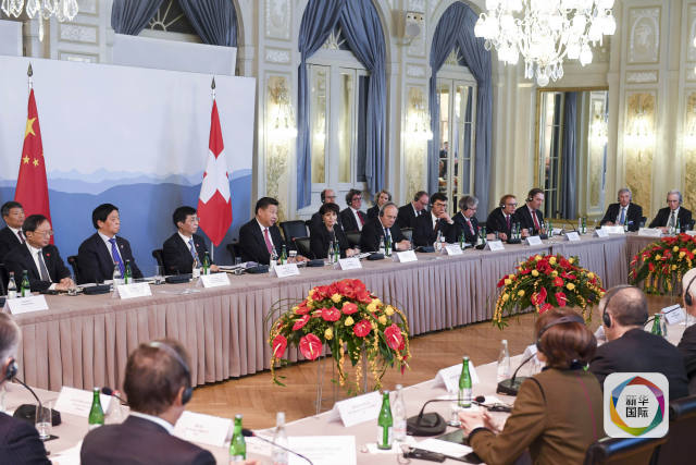 1月16日,國家主席習(xí)近平在伯爾尼同瑞士聯(lián)邦主席洛伊特哈德共同會見瑞士經(jīng)濟(jì)界代表。(新華社記者李學(xué)仁攝)