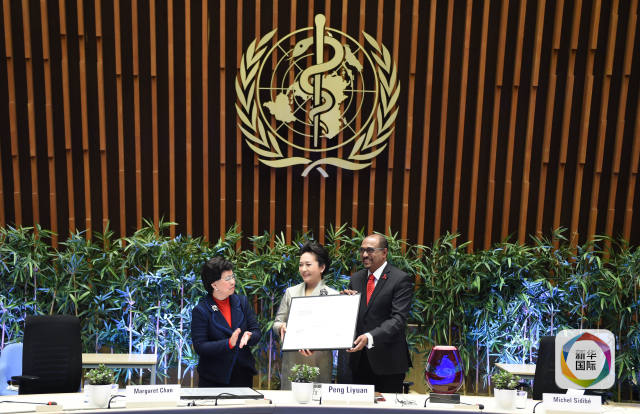 1月18日,國(guó)家主席習(xí)近平夫人、世界衛(wèi)生組織結(jié)核病和艾滋病防治親善大使彭麗媛應(yīng)世界衛(wèi)生組織總干事陳馮富珍和聯(lián)合國(guó)艾滋病規(guī)劃署執(zhí)行主任西迪貝邀請(qǐng),在瑞士日內(nèi)瓦出席為她舉行的親善大使任期續(xù)延暨頒獎(jiǎng)儀式。這是世界衛(wèi)生組織總干事陳馮富珍向彭麗媛頒發(fā)世衛(wèi)組織榮譽(yù)勛章。(新華社記者謝環(huán)馳攝)