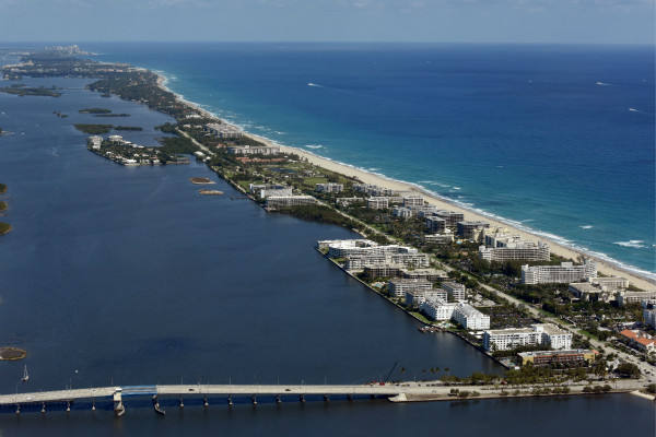 這是2017年3月20日航拍的美國(guó)佛羅里達(dá)州棕櫚灘的海岸線,海湖莊園就在這個(gè)狹長(zhǎng)的小島上。(新華社記者殷博古攝)