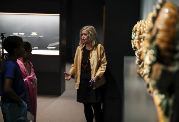 勞里·巴恩斯正在展館內(nèi)向小學(xué)生介紹中國(guó)文物。(新華社記者王迎攝)