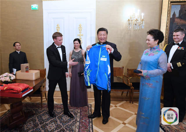 當(dāng)?shù)貢r(shí)間4月5日晚,國(guó)家主席習(xí)近平和芬蘭總統(tǒng)尼尼斯托在赫爾辛基共同會(huì)見剛剛參加完2017年世界花樣滑冰錦標(biāo)賽的中芬兩國(guó)冰雪運(yùn)動(dòng)員代表。習(xí)近平夫人彭麗媛和尼尼斯托夫人豪吉?dú)W參加會(huì)見。這是芬蘭運(yùn)動(dòng)員向習(xí)近平和夫人彭麗媛贈(zèng)送運(yùn)動(dòng)衣。新華社記者饒愛民攝