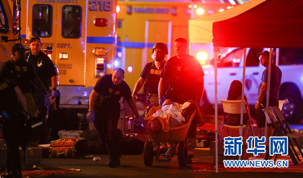 10月1日,在美國(guó)西部城市拉斯維加斯,工作人員在槍擊事件現(xiàn)場(chǎng)救治傷者。新華社/美聯(lián)