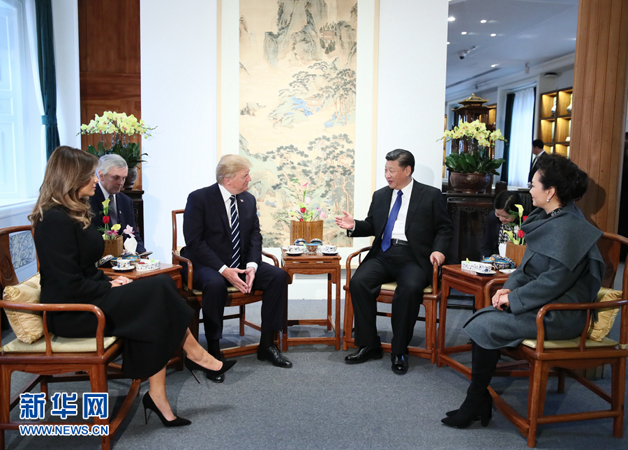 習(xí)近平和夫人彭麗媛同美國(guó)總統(tǒng)特朗普和夫人梅拉尼婭茶敘